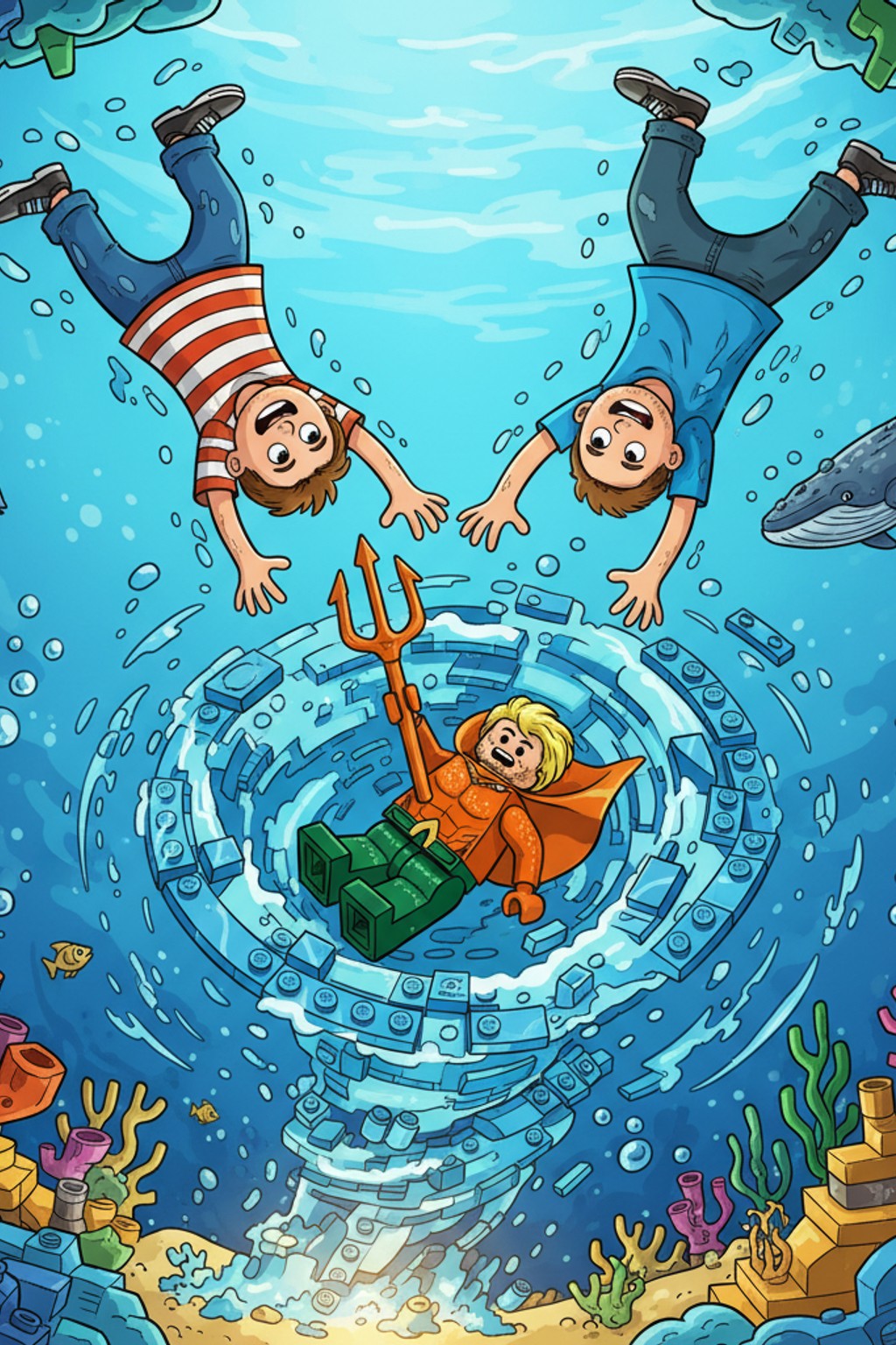 Aquaman was trapped in the centre of the largest pool, spinning helplessly as the LEGO water kept shifting and changing around him. His golden trident was just out of reach, stuck to a diving board that kept flipping between dimensions!