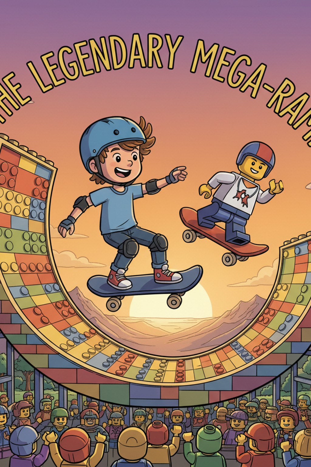 Stretching out before them was the most incredible skatepark ever built. But this wasn't any ordinary skatepark—everything was made entirely of LEGO bricks! Ramps curved up like frozen waves, half-pipes glittered in rainbow colours, and rails zigzagged through the air like roller coasters. In the centre stood the biggest ramp Alfie had ever seen—so tall it disappeared into the cotton-candy clouds above.