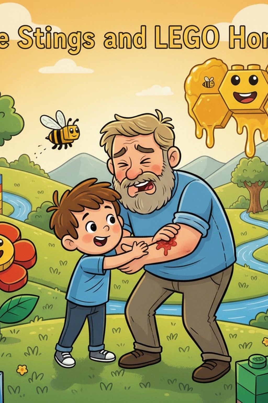 Back at the magnificent Golden Hive—a towering structure of hexagonal honey-coloured bricks—they watched the bees turn nectar into gleaming LEGO honey. Buzbi dabbed some on Dad's sting, and it vanished instantly!