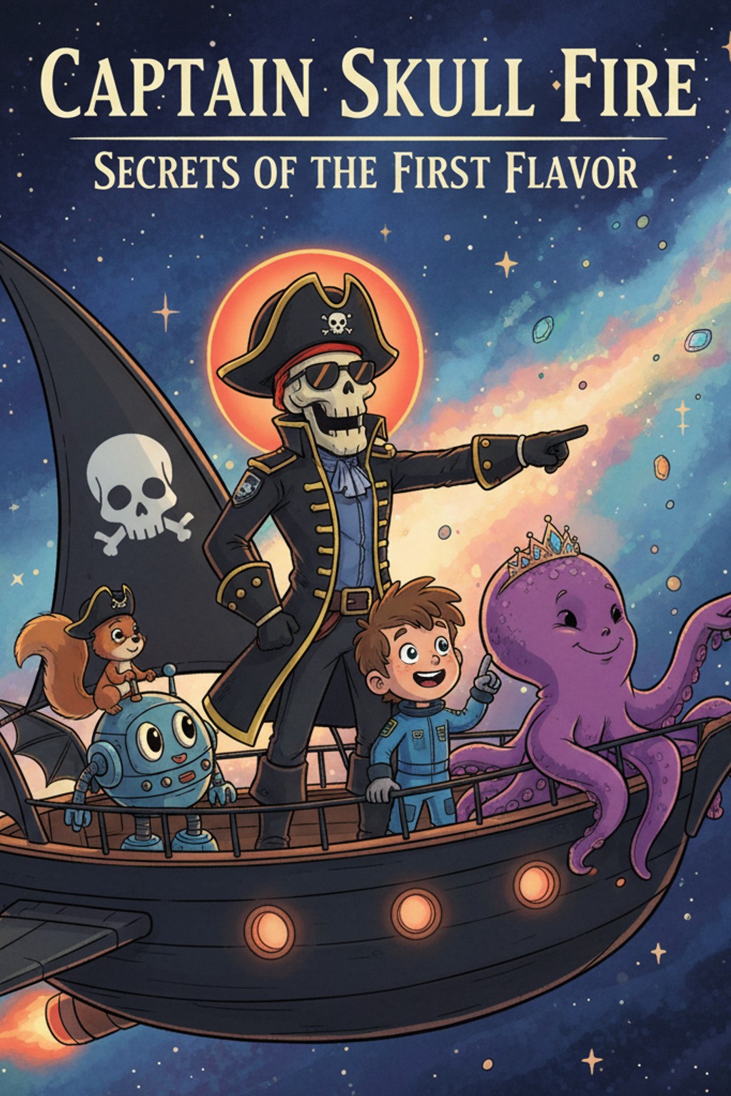 Captain Skull Fire paced the deck. The relics—the Sprinkle Orb, the Time Truffle, the Frosted Key, and now the glowing Compass of Primevalon—floated around a shimmering projection in midair, spinning like slices of a mysterious cosmic pie.