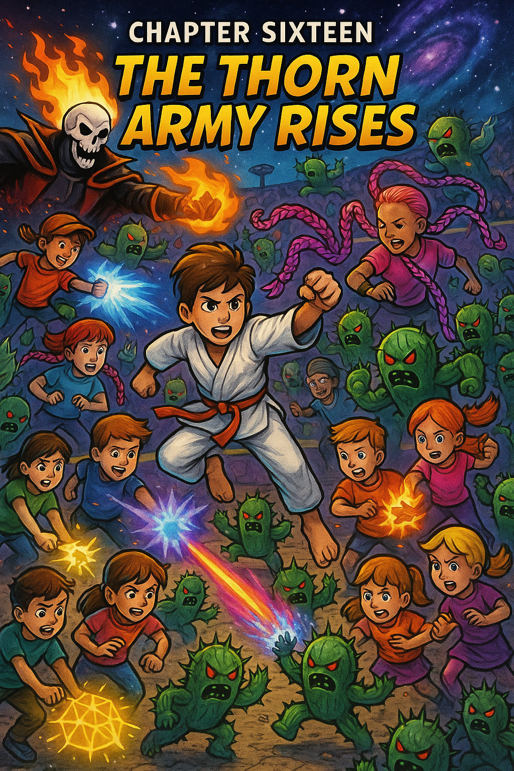 The cosmic sumo arena shook like thunder. The spines that Prickly Pear had shed wriggled across the floor, sprouting legs and arms. They rose up into an army of mini cactus warriors, each one with sharp thorns and glowing green eyes.