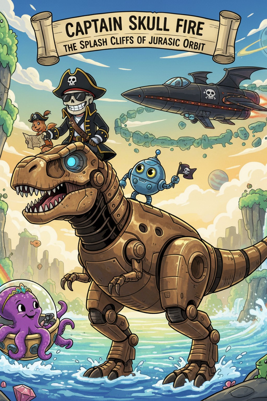 “Okay,” said Captain Skull Fire, scanning the map. “To win this zone’s treasure, we must navigate the waterfall cliffs, outrun a Mecha-T-Rex, and solve the riddle of the ancient dino bones.”