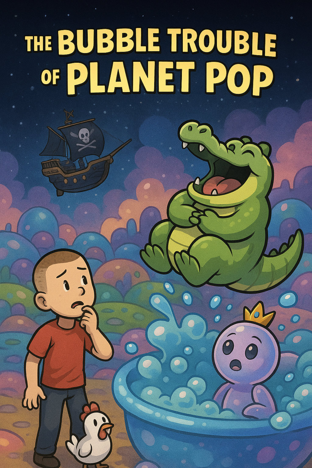 After surviving glitches, slime spas, and flying socks, the Black Dragon’s Foot sailed quietly through the Bubble Belt — a cluster of rainbow-colored planets that shimmered like soap bubbles in the sunlight.