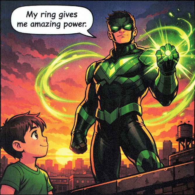 “Here we meet Emerald Guardian. He has a glowing ring that gives him power. But listen carefully — his power only works when he is calm. That means the power isn’t about being loud or strong. It’s about being steady.”