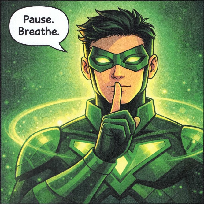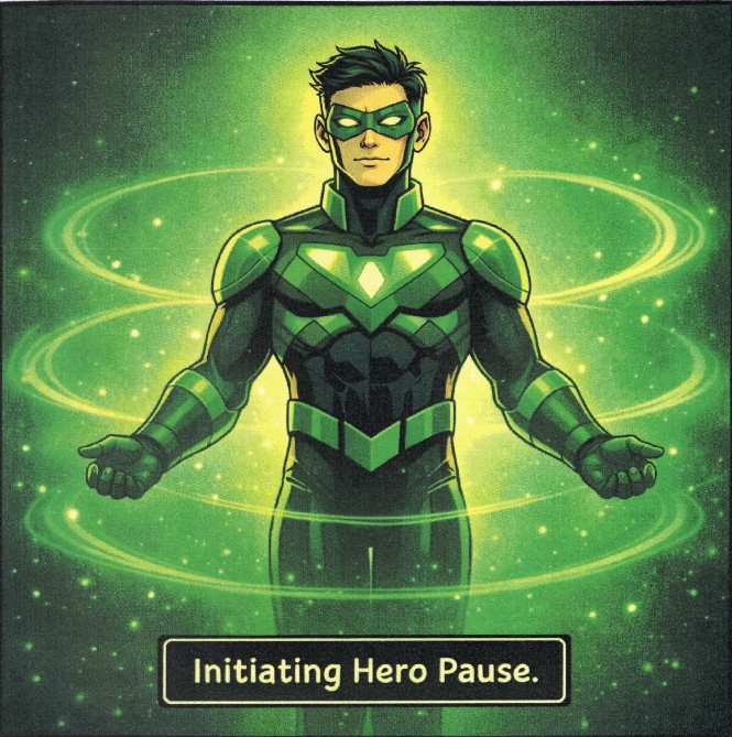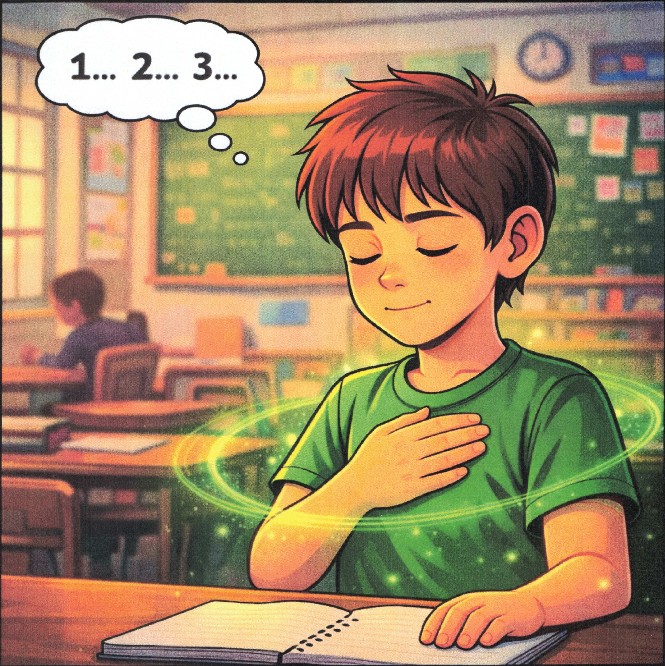 “This is the Hero Pause. First, stop. Then breathe.” “Notice how the glow becomes steady, not flickery.” “When we breathe slowly, our brain gets time to think again.” “Watch how he puts his hand on his chest. That helps him feel the breath.”