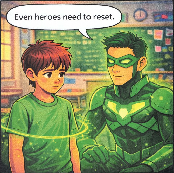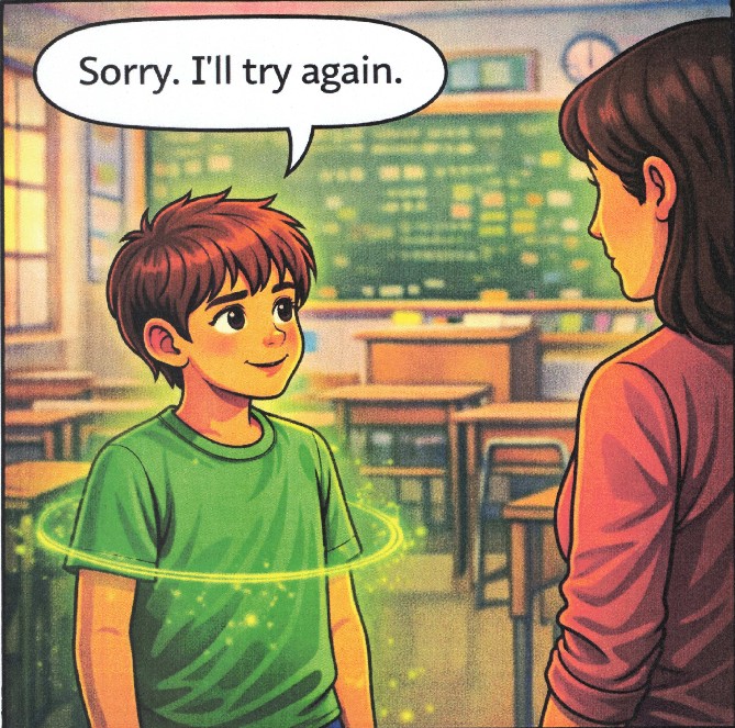 “That means mistakes are normal.” “Emerald Guardian doesn’t shame him. He says, ‘Even heroes reset.” “Reset means: calm your body, take responsibility, try again.” “Sorry. l’lltry again.’ That’s brave.”